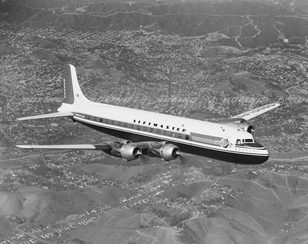 Douglas DC-6 (1946-1958): Nearly identical to the DC-4 in appearance, the DC-6 was first conceived as a long-range military transport. The plane made its maiden flight on February 15, 1946. The key difference between the DC-4 and DC-6 was the DC-6’s larger engines, which were twice as powerful as the engines on the DC-4. The DC-6 was the first Douglas airliner with a pressurized cabin, which enabled it to fly higher and faster, thus taking its passengers “over the weather.” The DC-6 was the most economical commercial aircraft of the propeller era. Its operating costs were among the lowest until jetliners came on the scene. Military versions were produced under the designations C-118 (Air Force) and R6D (Navy). President Harry Truman chose a DC-6 for official use, and christened it the “Independence,” for his hometown in Missouri. During its 12-year production run, Douglas delivered 537 DC-6s, plus 167 military versions.