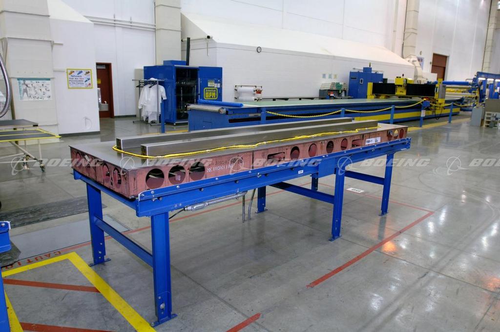 Carbon fiber beams are arranged on a precision table prior to the vacuum bagging process at the Boeing composites manufacturing facility in Frederickson, Washington.