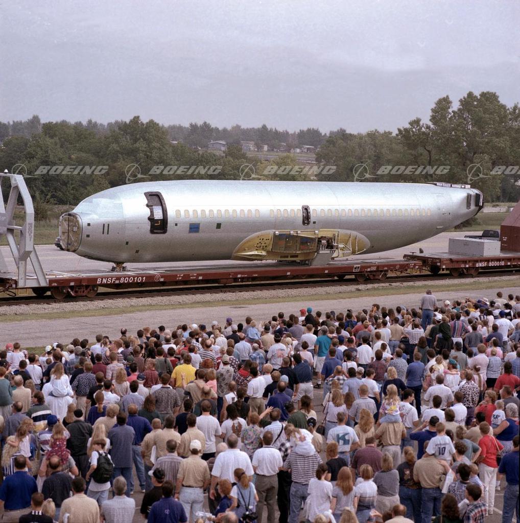 Cheered on by the Wichita, Kansas 737 team, the first fully assembled fuselage departs for Washington aboard a specially designed railcar.