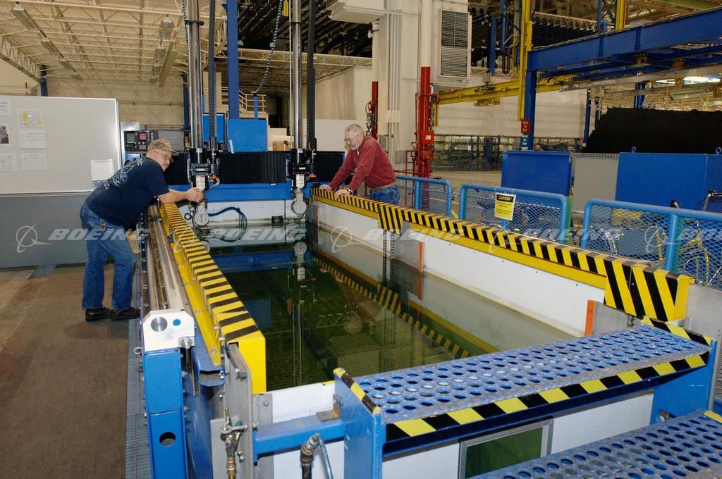 Non-destructive ultrasonic testing verifies manufacturing quality at the Boeing facility in Frederickson, Washington.