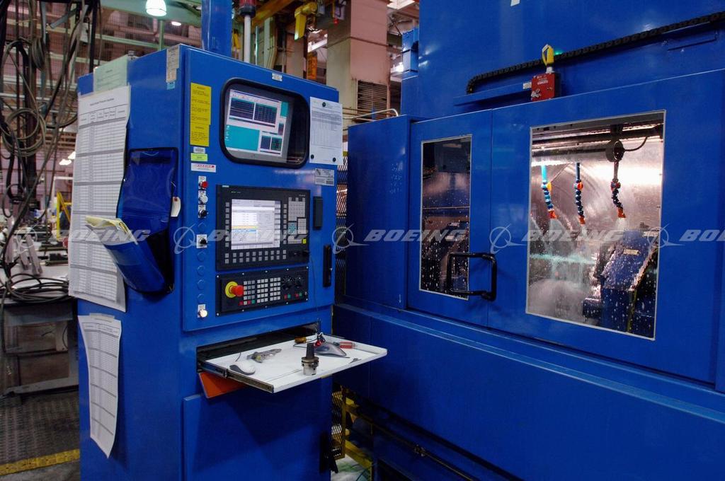 Automated numerically-controlled machines are used to drill and form cured composite parts at the Boeing composites manufacturing facility in Frederickson, Washington.
