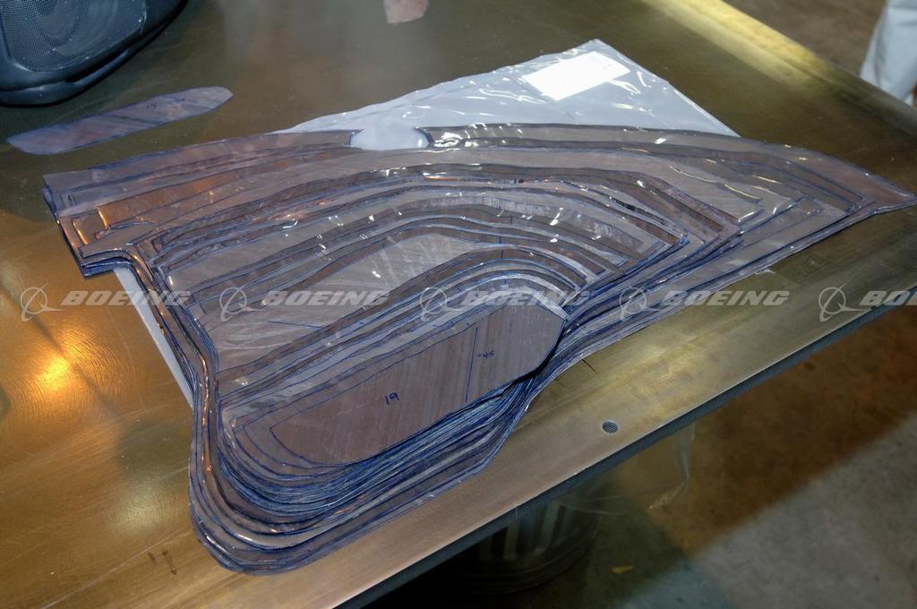 Pre-cut carbon fiber ply layers are stacked in preparation for the repair process at the Boeing composites manufacturing facility in Frederickson, Washington.