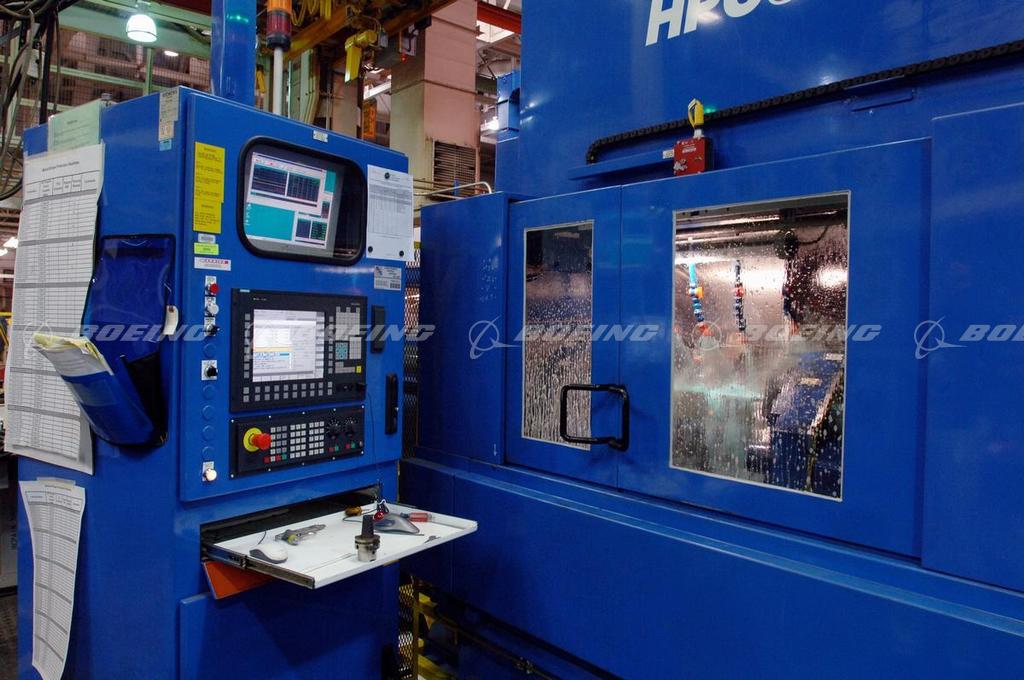 Automated numerically-controlled machines are used to drill and form cured composite parts at the Boeing composites manufacturing facility in Frederickson, Washington.