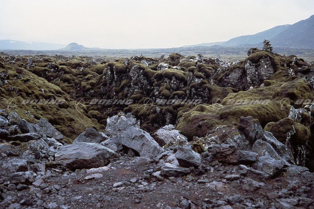 Moss-covered rocks on an inland landscape near Reykjavik.