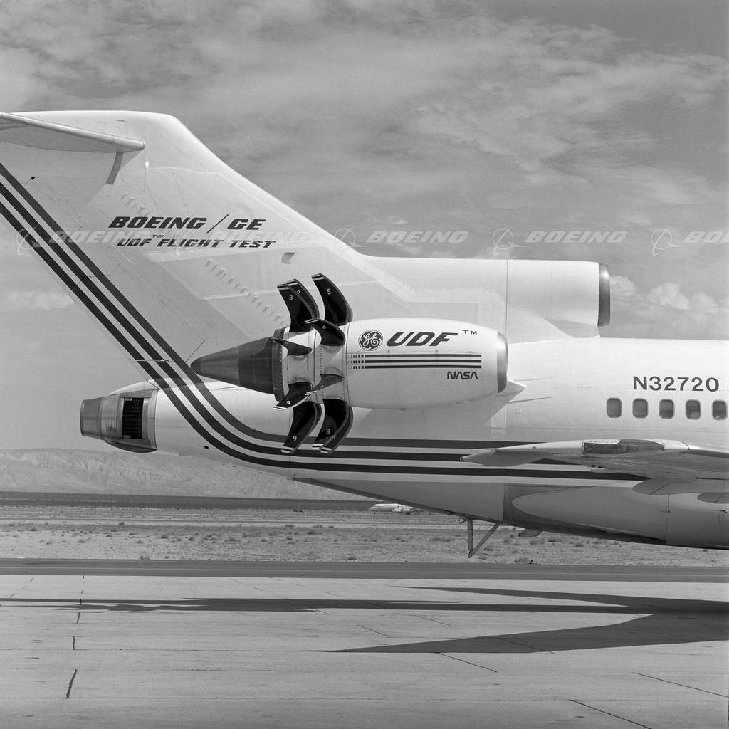 In the mid 1980s, Boeing used a company-owned 727 to test a new engine for a proposed twin propeller-turbine transport that was to be designated the Model 7-J-7. A prototype General Electric GE-36 UDF (unducted fan or propfan) engine was mounted on the right rear side in place of the standard turbo jet engine. The UDF engine was a hybrid between a turbofan and a turboprop. It had a significant weight reduction and a 45% increase in fuel efficiency, however, Boeing did not develop the 7-J-7 that was used to test it.