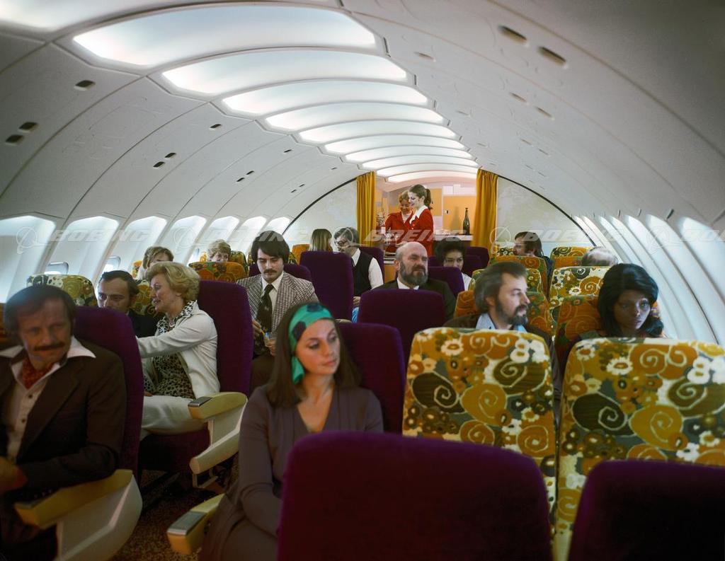 The full-scale interior mockup of the 747 at Boeing's Renton facility was modified to accomodate the 747SP program. The mockup was divided into four zones and decorated in bright, modern colors in the style of the 70s.