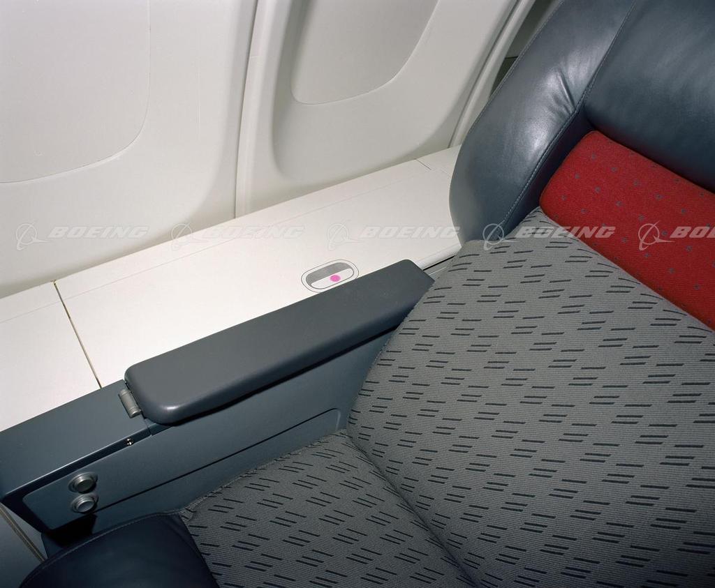 747-400 Interior Solutions features blended main cabin ceilings and center stowbins; softer, smoother-contoured surfaces that help reduce shadowing and provide a more open feeling in the cabin, resulting in an interior similar to the modern, graceful lines of the 777 interior. The upper deck's enhanced overhead bins and floor-mounted stowage boxes (shown here on a mock-up) can accommodate 12 to 14 more 14- by 9- by 22-inch bags.