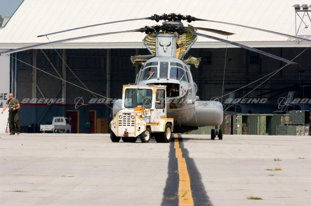 A CH-46E Sea Knight is Towed from a Maintenance Hangar at MCAS New River