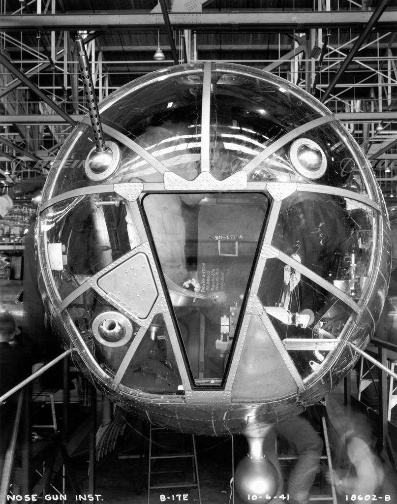 The B-17E plexiglass nose cone featured ball and socket machine gun mounts.