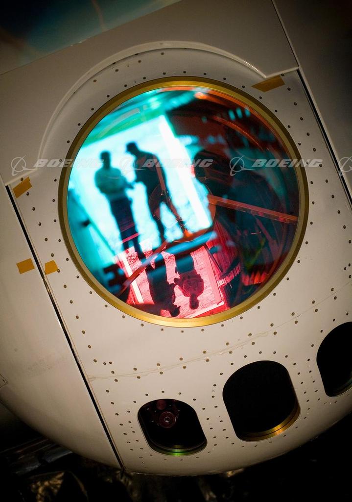 Boeing SVS Technicians Reflected in the Turret of the Advanced Tactical Laser (ATL)