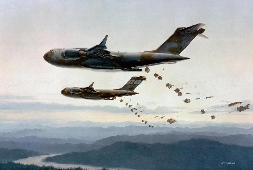The C-17's ability to fly long distances and land in remote airfields in rough, land-locked regions make it a premier transporter for military, humanitarian and peacekeeping missions. It can drop a single 60,000-lb. payload, with sequential load drops of 110,000 lb.