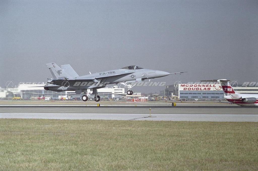 First Flight of the Super Hornet The F/A-18E/F Super Hornet takes off on its first flight Nov. 29, 1995 from St. Louis Lambert International Airport with McDonnell Douglas pilot Fred Madenwald at the controls. After lifting off at 11:15 a.m. (CST), Madenwald said the new aircraft was smooth, precise and easy to control during its flight. As a structural upgrade of the F/A-18C/D, the Super Hornet is 25 percent larger and offers longer range, greater endurance, increased weapons and fuel-carrying capability, improved survivability and substantial capacity for growth.