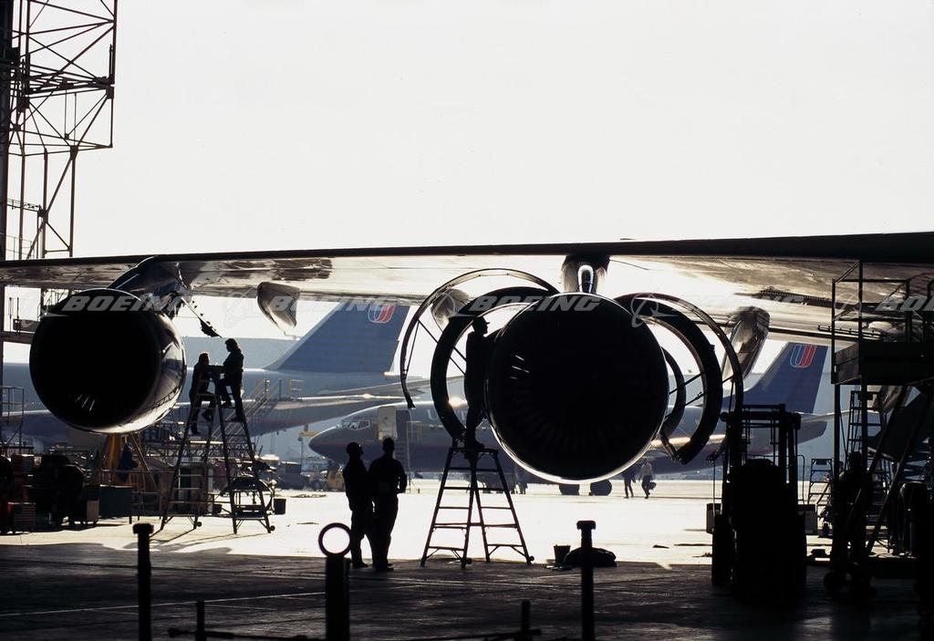 Silhouetted 747 Jet Engine Maintenance Crew at Sunset