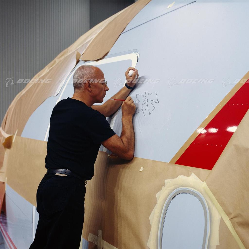 Worker Applies Finishing Touches to a 777 in Paint Hangar