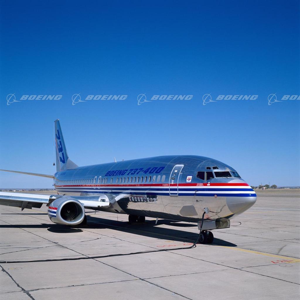 Development of the quieter, more fuel-efficient CFM56-3 series of engines allowed Boeing to improve its most popular jetliners and produce the advanced-technology 737-330, -400, and -500. The engines are larger and mounted forward of the wing struts instead of tucked directly under the wing as in the -100 and -200 versions. Advancements on the new-generation 737s included a stregthened wing to accomodate greater gross weight, tip extensions to the wings and horizontal stabilizers, and stregthened wheels, tires and brakes. The 737-200, -300, -400, -500 have the same handling characteristics so that pilots can use the same Type rating to fly all of them. Airlines' spares inventory and maintenance are simplified by making a substantial number of replaceable parts on the -300, -400, -500 identical to those used on the -200. The 737-400 is about 10 feet longer than the 737-300. It holds 19 more passengers and has a gross weight of up to 150,000 pounds, while retaining the same fuel efficiency, low noise, and low operating costs as its predecessor.