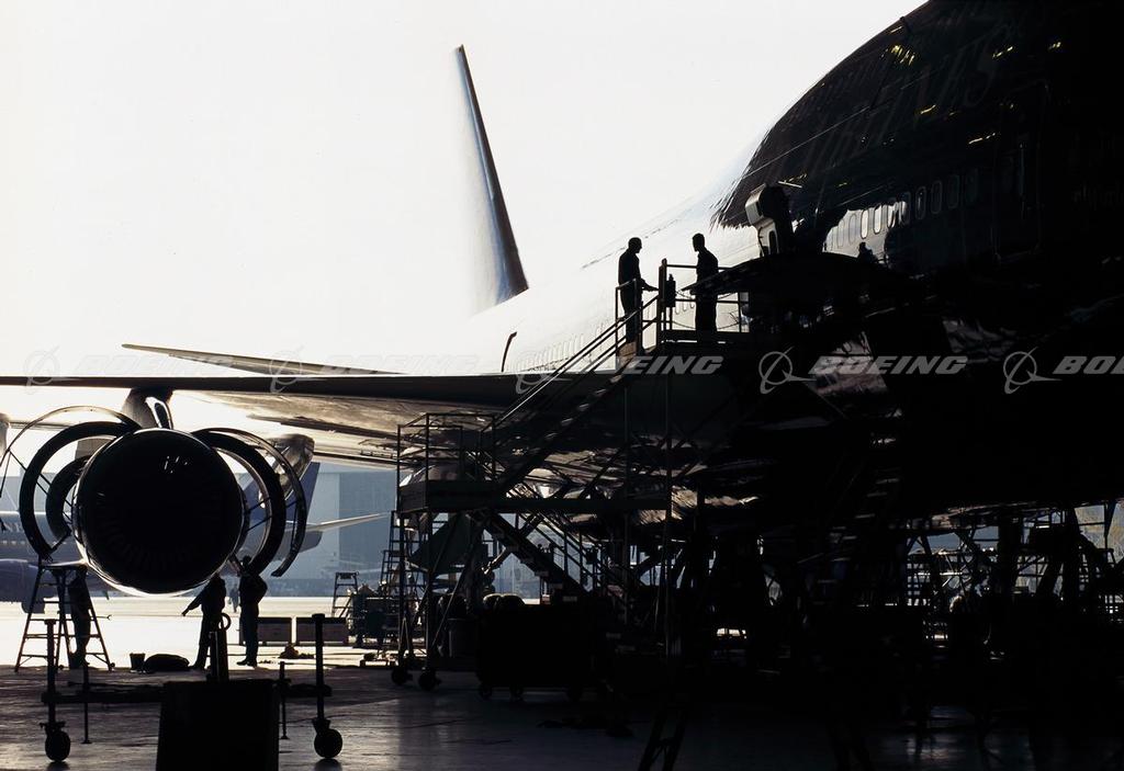 Silhouetted 747 Jet Engine Maintenance Crew at Sunset