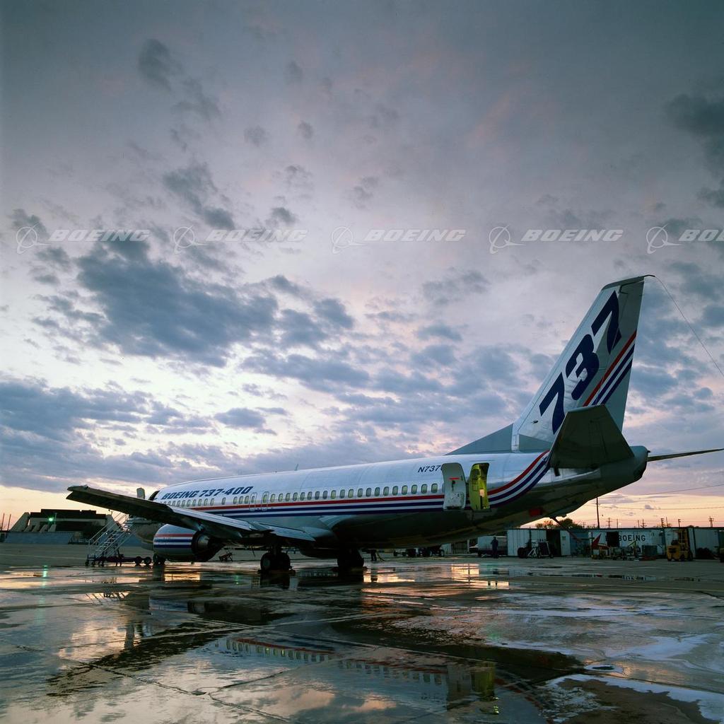 Development of the quieter, more fuel-efficient CFM56-3 series of engines allowed Boeing to improve its most popular jetliners and produce the advanced-technology 737-300, -400, and -500. The engines are larger and mounted forward of the wing struts instead of tucked directly under the wing as in the -100 and -200 versions. Advancements on the new-generation 737s included a stregthened wing to accomodate greater gross weight, tip extensions to the wings and horizontal stabilizers, and stregthened wheels, tires and brakes. The 737-200, -300, -400, -500 have the same handling characteristics so that pilots can use the same Type rating to fly all of them. Airlines' spares inventory and maintenance are simplified by making a substantial number of replaceable parts on the -300, -400, -500 identical to those used on the -200. The 737-400 is about 10 feet longer than the 737-300. It holds 19 more passengers and has a gross weight of up to 150,000 pounds, while retaining the same fuel efficiency, low noise, and low operating costs as its predecessor.