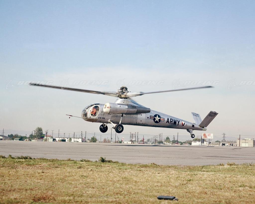 The XV-9A "Hot Cycle" research aircraft first flew in Nov. 1964 from the runway of the Hughes Helicopter Division facilities in Culver City. The test program, which expanded the company's understanding of jet-driven rotor helicopters, was completed in Aug. 1965. Both the XH-17 and XV-9A experimental programs provided useful information about helicopters that could fly without tail rotors — a development that Hughes pursued further in the late 1970s and early 1980s.