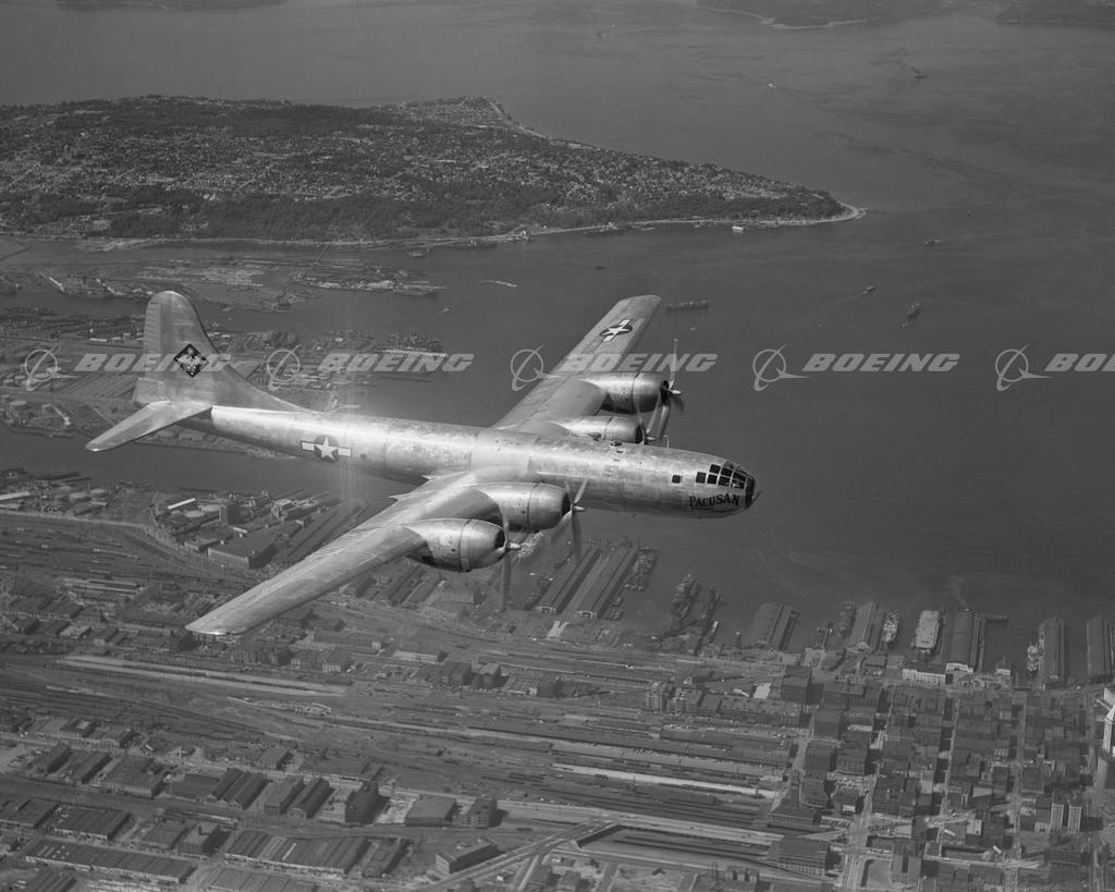 Boeing submitted the prototype for the B-29 long-range heavy bomber to the Army in 1939, before the United States entered World War II. The B-29 had many new features, including guns that could be fired by remote control. The crew areas were pressurized and connected by a long tube over the bomb bays. The tail gunner had a separate pressurized area that could only be left during unpressurized flight. The B-29 was also the heaviest production plane because of increases in range, bomb load and defensive requirements. B-29s were primarily used in the Pacific theater during World War II. As many as 1,000 Superfortresses at a time bombed Tokyo, destroying large parts of the city. Finally, on Aug. 6, 1945, the B-29 Enola Gay dropped the world's first atomic bomb on Hiroshima, Japan. Three days later a second B-29, Bockscar, dropped another atomic bomb on Nagasaki. Shortly thereafter, Japan surrendered. After the war, B-29s were adapted for several functions, including in-flight refueling, anti-submarine patrol, weather reconnaissance and rescue duty. The B-29 saw military service again in Korea between 1950 and 1953, battling new adversaries: jet fighters and electronic weapons. Production ended in 1946. The last B-29 in squadron use retired from service in September 1960.