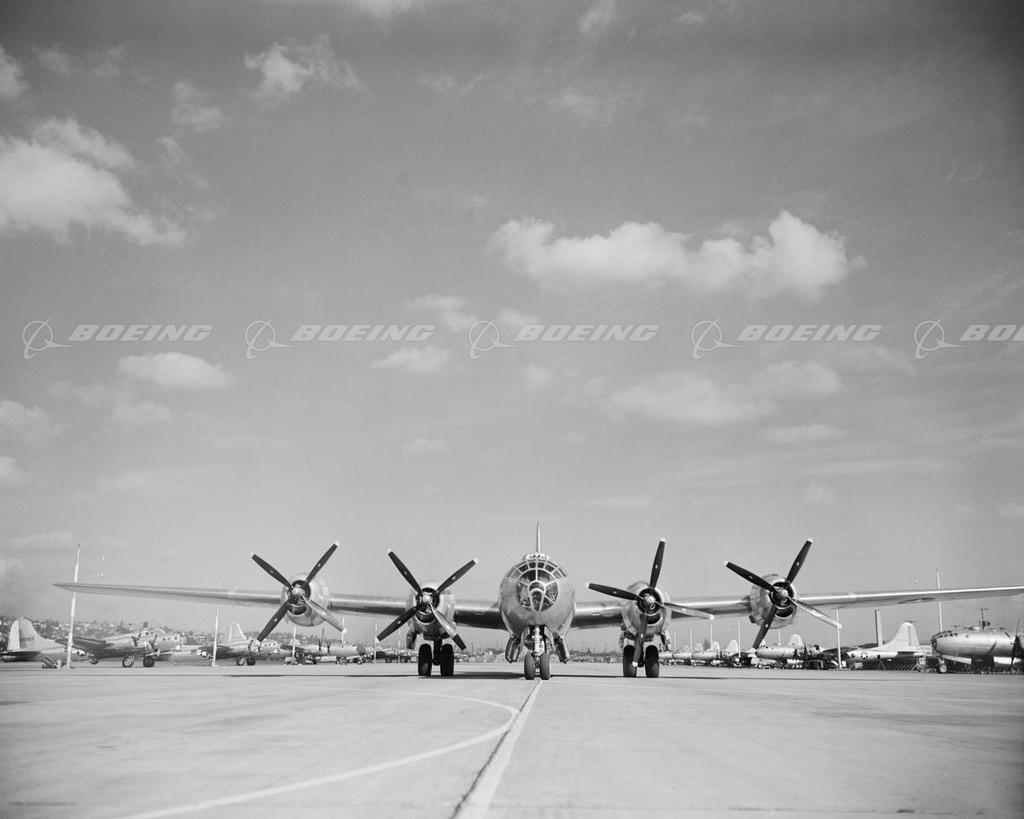 The Boeing B-29 Superfortress, the most technologically advanced airplane produced during World War II, first flew Sept. 21, 1942. The B-29 had many new features, including guns that could be fired by remote control. The crew areas were pressurized and connected by a long tube over the bomb bays. The tail gunner had a separate pressurized area that could only be left during unpressurized flight. At 105,000 pounds, the B-29 was also the heaviest production plane because of increases in range, bomb load and defensive requirements. The B-29 used the high-speed Boeing 117 airfoil, and its larger Fowler flaps added to the wing area as they increased lift. Modifications led to the B-29D, upgraded to the B-50, and the RB-29 photo reconnaissance aircraft. The Soviet-built copy of the B-29 was called the Tupolev Tu-4. A total of 3,970 B-29s were built.