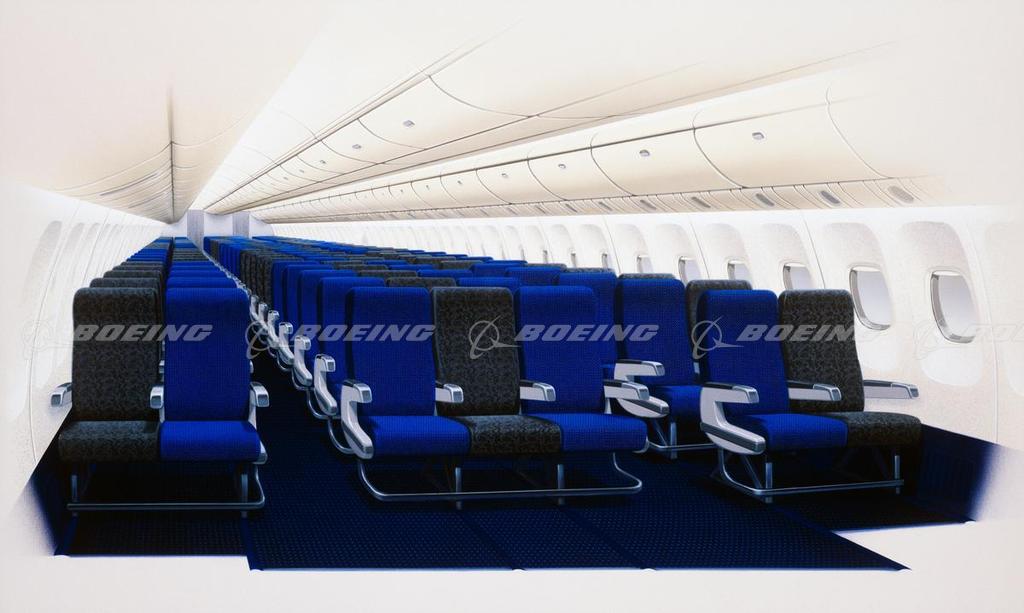 This series of artist's conceptions of the new 767-400ER (extended range) interior shows first-, business- and economy-class services. The sculpted sidewalls, ceilings and higher-volume stow bins create a spacious interior architecture that is similar to the 777. This interior retains features that passengers prefer on existing 767s, such as the seven-abreast seating, which places 87 percent of the seats next to a window or aisle.