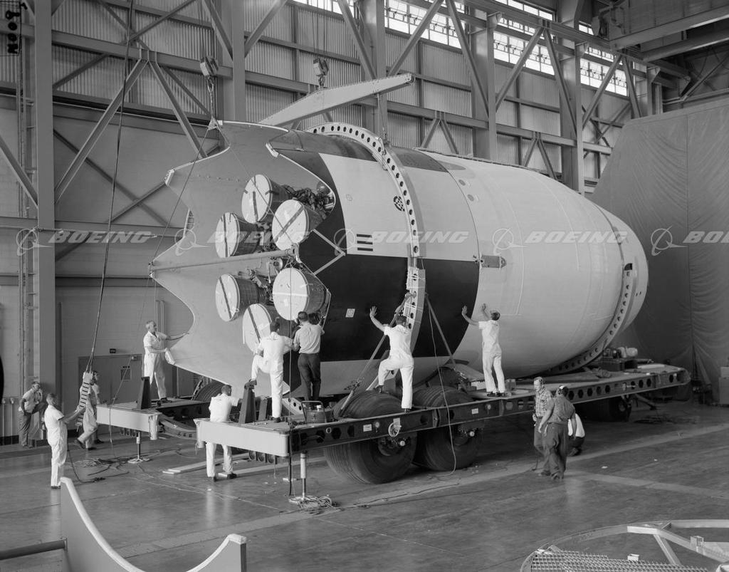 In 1961 NASA contracted Boeing to build the 138-foot, 300,000-pound S-1C boosters that were the first stage of the 363-foot Apollo/Saturn V launch vehicles that would blast Apollo capsules to the moon. The first-stage booster, designed by Boeing in Huntsville, Ala., and assembled in New Orleans, La., had 7.5 million pounds of thrust and was a quantum leap beyond other rockets of the time. Its task was to hurl a 120-ton payload into orbit around the Earth. North American Rockwell built the S-II second stage, the command and service modules, and the F-1 and J-2 rocket engines, and the McDonnell Douglas Corp. built the S-IVB third stage. As time went on, Boeing was given more responsibility for the Saturn V program and, by 1964, was in charge of assembling all three stages of the rocket and providing mission support. Boeing also provided the technical staff at Cape Kennedy, responsible for checkout support during final assembly.