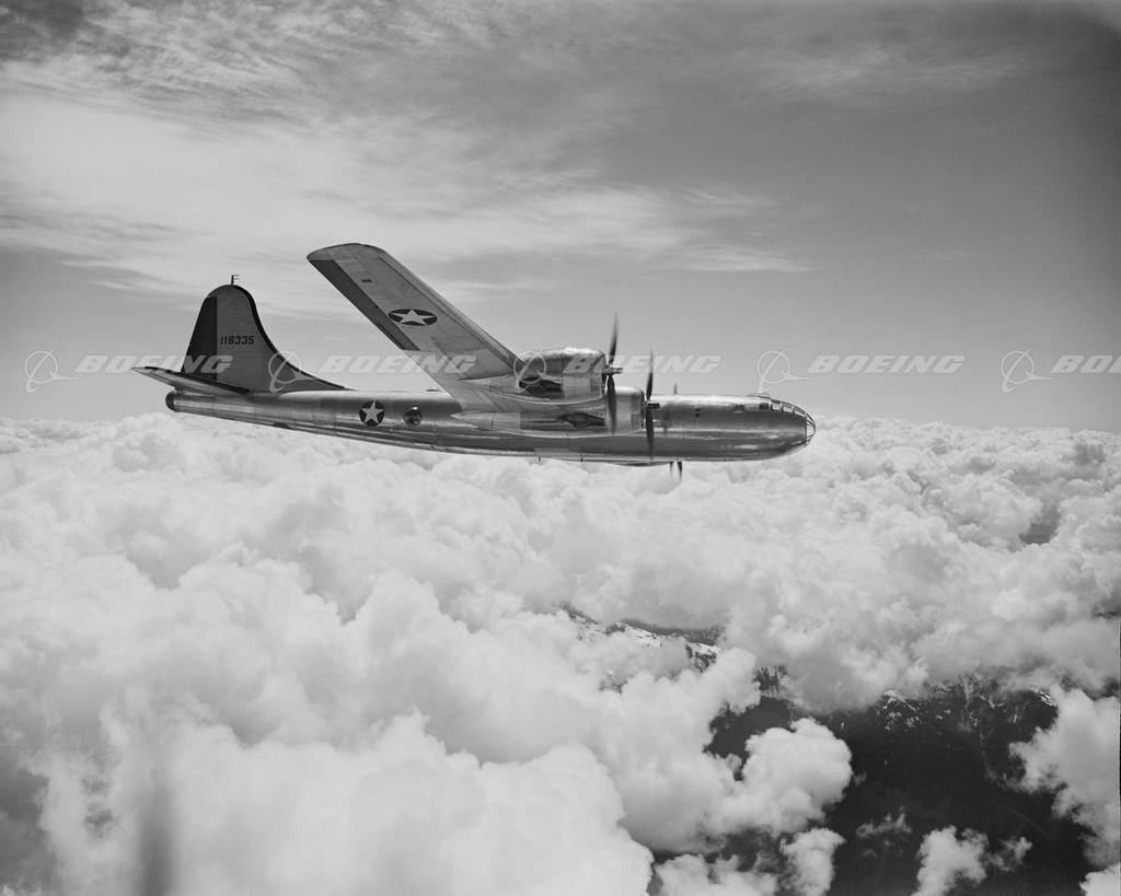 The Boeing B-29 Superfortress, the most technologically advanced airplane produced during World War II, first flew Sept. 21, 1942. The B-29 had many new features, including guns that could be fired by remote control. The crew areas were pressurized and connected by a long tube over the bomb bays. The tail gunner had a separate pressurized area that could only be left during unpressurized flight. At 105,000 pounds, the B-29 was also the heaviest production plane because of increases in range, bomb load and defensive requirements. The B-29 used the high-speed Boeing 117 airfoil, and its larger Fowler flaps added to the wing area as they increased lift. Modifications led to the B-29D, upgraded to the B-50, and the RB-29 photo reconnaissance aircraft. The Soviet-built copy of the B-29 was called the Tupolev Tu-4. A total of 3,970 B-29s were built.