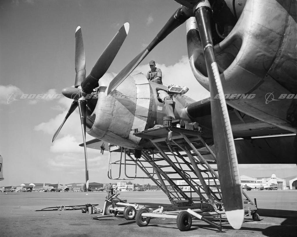 Mechanic Servicing a B-29 Superfortress, Dwarfed by Propeller
