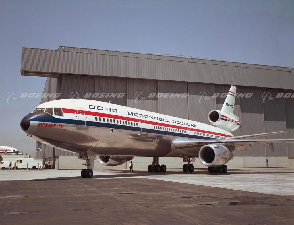McDonnell Douglas DC-10 (1970-1990): The DC-10 made its first flight on August 20, 1970. Although smaller than the Boeing 747, its wide cabin gave it a passenger capacity up to 380 (depending upon seating configuration). The DC-10 was designed as a multi-range jetliner capable of operations from airports with relatively short runways, such as New York’s La Guardia with a full load bound for Chicago, or from longer runways, like St. Louis Lambert International for a non-stop flight to London. A new generation of turbofan jet engines, which produced more than twice the power but half the noise of the turbojet engines used on the first generation of jetliners, powered the big trijet. The DC-10 was produced in three basic models: the Series 10 for domestic routes, and the Series 30 and 40 for extended range and intercontinental travel. During the plane’s 20-year production run, 386 DC-10s were delivered. In addition, 60 were built as KC-10 cargo/tanker aircraft for the Air Force. Six commercial models of the DC-10 were developed. The Series 10 model was designed for service on routes of up to 4,000 statute miles (6,436 km). The intercontinental range Series 40, powered by Pratt & Whitney JT9D turbofan engines, had a nonstop range up to approximately 5,800 miles (9,322 km). The Series 30, an intercontinental model had a range of approximately 5,900 miles (9,493 km). The DC-10 Convertible Freighter, first delivered in 1973, can be arranged to carry all passengers or all cargo and is available in the basic Series 10, Series 30 or Series 40. The Series 15, launched in 1979, combines the basic smaller airframe of the Series 10 with a version of the more powerful engines used on the longer-range Series 30s. The DC-10 Series 30F, an all-freighter model, was ordered by Federal Express in May 1984. First delivery was made Jan. 24, 1986. This pure freighter version will carry palletized payloads of up to 175,000 pounds (79,380 kg) more than 3,800 miles (6,115 km).