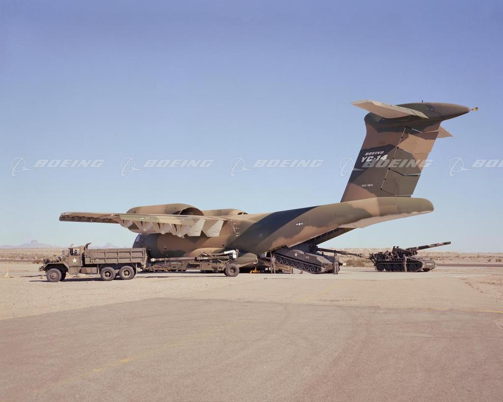 The Boeing YC-14 first flew in 1976 and could takeoff with a payload of 27,000 pounds in less than 1,000 feet in order to carry troops and equipment into battle zones with short, temporary airfields. Cargo and wheeled vehicles could be loaded into the wide fuselage via a built-in tail ramp. Although the YC-14 never went into production, the two prototypes introduced significant technological breakthroughs, most notably an upper-surface-blowing (USB) design for high aerodynamic lift. The achievements of the YC-14 contributed in a significant way to advance studies of STOL technology.