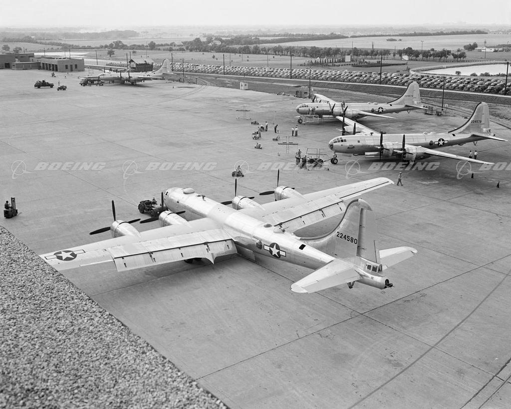 The Boeing B-29 Superfortress, the most technologically advanced airplane produced during World War II, first flew Sept. 21, 1942. The B-29 had many new features, including guns that could be fired by remote control. The crew areas were pressurized and connected by a long tube over the bomb bays. The tail gunner had a separate pressurized area that could only be left during unpressurized flight. At 105,000 pounds, the B-29 was also the heaviest production plane because of increases in range, bomb load and defensive requirements. The B-29 used the high-speed Boeing 117 airfoil, and its larger Fowler flaps added to the wing area as they increased lift. Modifications led to the B-29D, upgraded to the B-50, and the RB-29 photo reconnaissance aircraft. The Soviet-built copy of the B-29 was called the Tupolev Tu-4. A total of 3,970 B-29s were built.