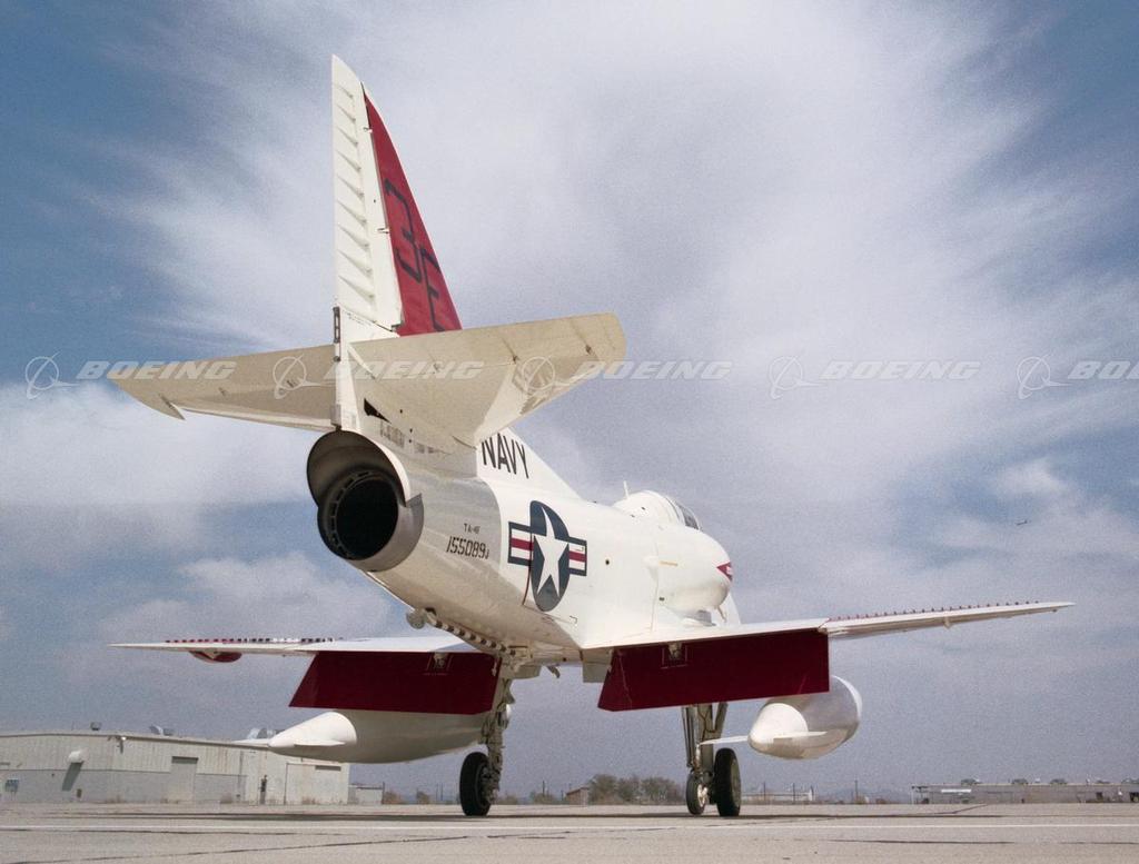 Douglas A-4 Skyhawk (1954-1979): Another successful attack aircraft from the Ed Heinemann team at Douglas was the A-4 Skyhawk. Designed for carrier operations, the Skyhawk was America’s smallest combat jet. Known as “Heinemann’s Hot Rod,” “Scooter,” and the “Mighty Midget,” it reversed the trend toward bigger and more complex aircraft in favor of durability and reliability. The A-4D first flew on June 22, 1954, demonstrating combinations of high performance and lightweight, with speed and maneuverability never before seen in an attack jet. After 1962, the joint service designation was changed to A-4. Behind the AD Skyraider, the A-4 Skyhawk was the most numerous postwar combat aircraft built by Douglas. During its long service career, the U.S. Navy and Marine Corps and the air arms of six other nations flew the A-4 The Skyhawk saw combat in Vietnam, the Middle East, the Falkland Islands, and the Persian Gulf. For 12 years, from 1974 to 1986, the A-4 Skyhawk served with the Navy’s Blue Angels flight demonstration team. In 1979, twenty-five years after its first flight, the last of 2,960 A-4s was delivered. Two-seat trainer versions included the TA-4F, TA-4J and the TA-4K Series. In addition to its primary role as a jet trainer, the TA-4 retained the A-4’s combat capabilities with bombs, rockets, missiles and guns. The TA-4 series had a slightly longer fuselage but carried less internal fuel than the A-4 attack bomber series. The first of the A-4 jet trainer series was delivered to the U.S. Navy in February 1966. A total of 555 TA-4 jet trainers were built. An additional 23 TA-4s were modified from A-4 airframes.