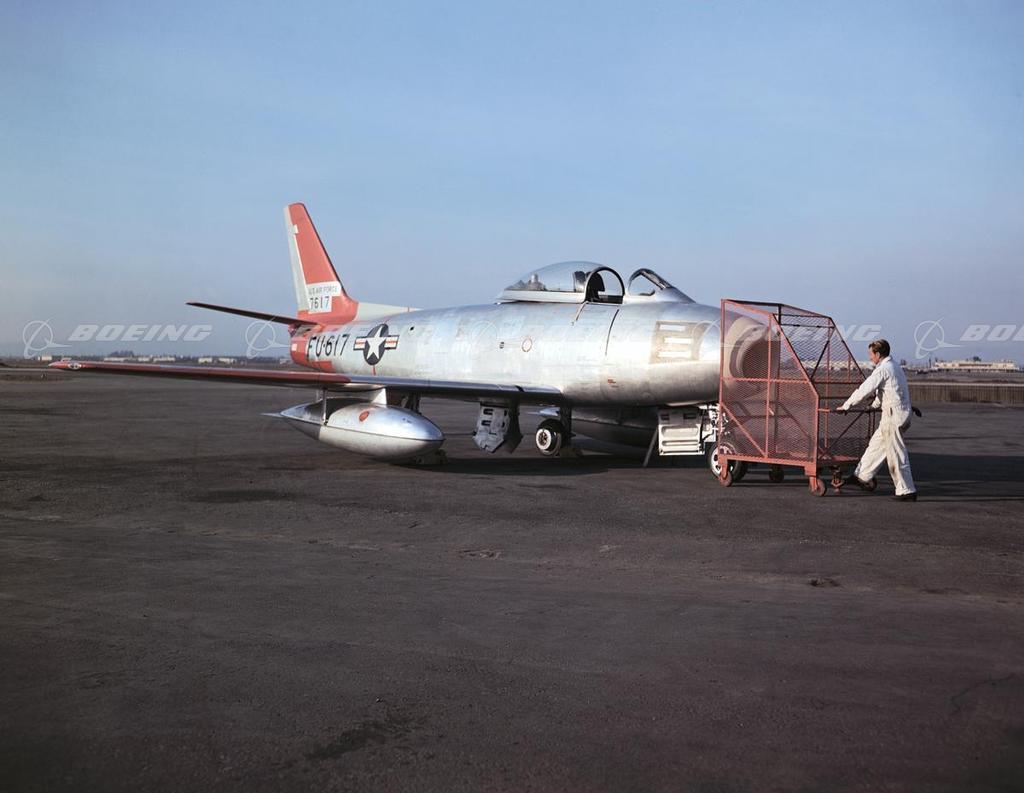 The North American F-86 Sabre Jet made its first flight Oct. 1, 1947, and was America’s first single-seat, swept-wing jet fighter. In 1948, it set a new world speed record of 671 mph, and it was the world’s first-line fighter for more than a decade after it was designed. More than 6,000 Sabre Jets were built worldwide. During the Korean conflict, the Sabre Jet flew 82,177 sorties during 32 months of combat and troop support. Four models of the craft (F-86A, E, F and H) were day fighters or fighter bombers, while the F-86D, K and L versions were all-weather interceptors and sported black radome noses, replacing the yawning jet intakes of the other models. The version built for the U.S. Navy and Marine Corps was called the FJ-2 Fury.