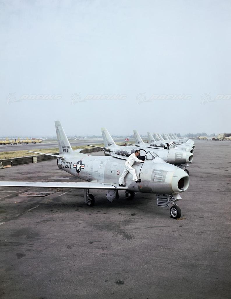 The North American F-86 Sabre Jet made its first flight Oct. 1, 1947, and was America’s first single-seat, swept-wing jet fighter. In 1948, it set a new world speed record of 671 mph, and it was the world’s first-line fighter for more than a decade after it was designed. More than 6,000 Sabre Jets were built worldwide. During the Korean conflict, the Sabre Jet flew 82,177 sorties during 32 months of combat and troop support. Four models of the craft (F-86A, E, F and H) were day fighters or fighter bombers, while the F-86D, K and L versions were all-weather interceptors and sported black radome noses, replacing the yawning jet intakes of the other models. The version built for the U.S. Navy and Marine Corps was called the FJ-2 Fury.