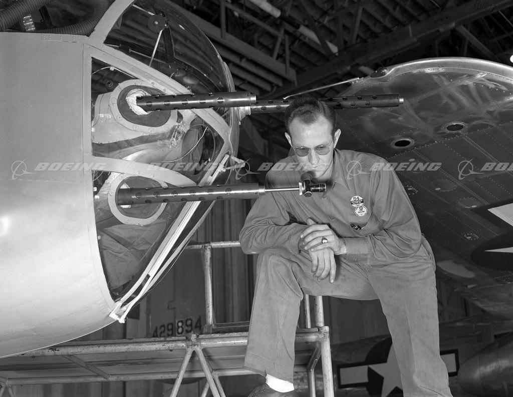 Man with B-25H Mitchell .50 Caliber Waist Gun
