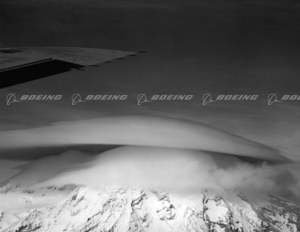 377 Stratocruiser in Flight Over Clouds and Mt. Rainier