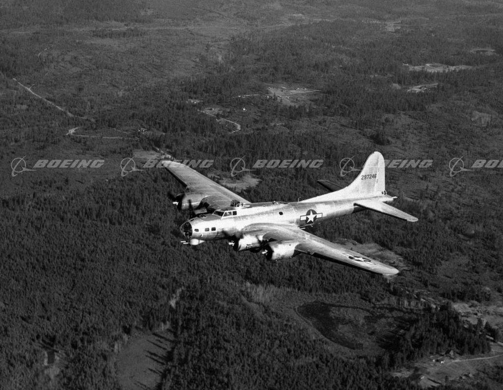 In response for the Army’s request for a large, multiengine bomber, the B-17 (Model 299) prototype, financed entirely by Boeing, went from design to flight test in less than 12 months. The B-17 Flying Fortress was a low-wing monoplane that combined aerodynamic features of the XB-15 giant bomber, and the Model 247 transport. The B-17 was the first Boeing military aircraft with a flight deck instead of an open cockpit and was armed with bombs and five .30-caliber machine guns mounted in clear blisters. Each version of the B-17 was more heavily armed. Described by General H. H. Hap Arnold, as the backbone of our worldwide aerial offensive, the B-17 Flying Fortress served in every World War II combat zone. Boeing, Douglas, and Lockheed Vega produced 12,731 B-17s, and the four-engine bombers became legendary for their ability to stay in the air after taking brutal poundings.