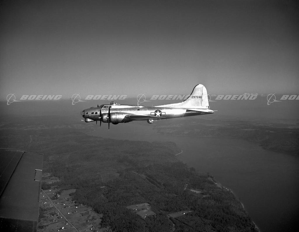 In response for the Army’s request for a large, multiengine bomber, the B-17 (Model 299) prototype, financed entirely by Boeing, went from design to flight test in less than 12 months. The B-17 Flying Fortress was a low-wing monoplane that combined aerodynamic features of the XB-15 giant bomber, and the Model 247 transport. The B-17 was the first Boeing military aircraft with a flight deck instead of an open cockpit and was armed with bombs and five .30-caliber machine guns mounted in clear blisters. Each version of the B-17 was more heavily armed. Described by General H. H. Hap Arnold, as the backbone of our worldwide aerial offensive, the B-17 Flying Fortress served in every World War II combat zone. Boeing, Douglas, and Lockheed Vega produced 12,731 B-17s, and the four-engine bombers became legendary for their ability to stay in the air after taking brutal poundings.