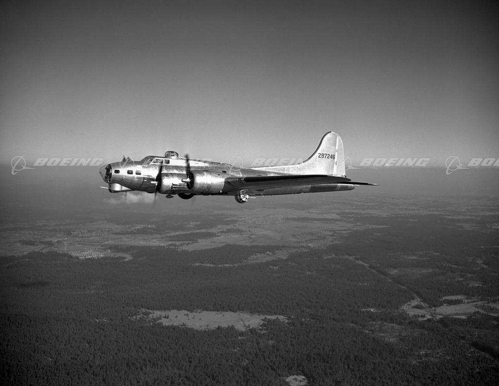 In response for the Army’s request for a large, multiengine bomber, the B-17 (Model 299) prototype, financed entirely by Boeing, went from design to flight test in less than 12 months. The B-17 Flying Fortress was a low-wing monoplane that combined aerodynamic features of the XB-15 giant bomber, and the Model 247 transport. The B-17 was the first Boeing military aircraft with a flight deck instead of an open cockpit and was armed with bombs and five .30-caliber machine guns mounted in clear blisters. Each version of the B-17 was more heavily armed. Described by General H. H. Hap Arnold, as the backbone of our worldwide aerial offensive, the B-17 Flying Fortress served in every World War II combat zone. Boeing, Douglas, and Lockheed Vega produced 12,731 B-17s, and the four-engine bombers became legendary for their ability to stay in the air after taking brutal poundings.