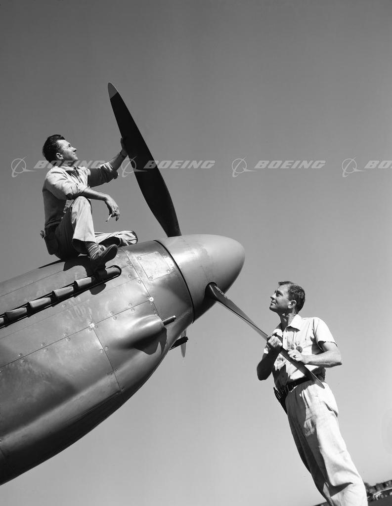 Two Men Inspect a P-51 Mustang Propeller