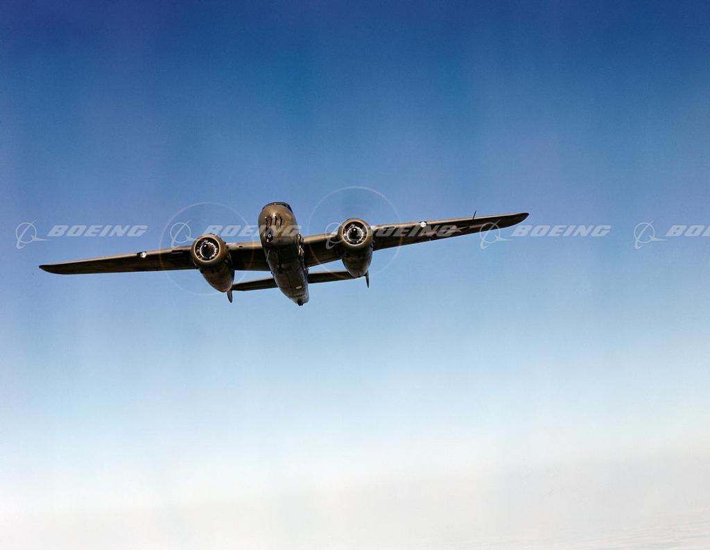 Named after General 'Billy' Mitchell, America's foremost supporter of air power, the B-25 Mitchell first flew on Aug. 19, 1940, and was the first multiengine design to go beyond the prototype stage. North American Aviation built more than 11,000 B-25s for the U.S. Army Air Forces and the U.S. Navy, which called it the PBJ, plus 50 each for China and Great Britain. The B-25 bomber had a wingspan of 67 feet and was 52 feet 11 inches long. One version, the B-25H, was the most heavily armed attack bomber of its time, with a 75-millimeter gun, up to 14 .50 caliber machine guns and 5,000 pounds of bombs carried in an internal bomb bay.