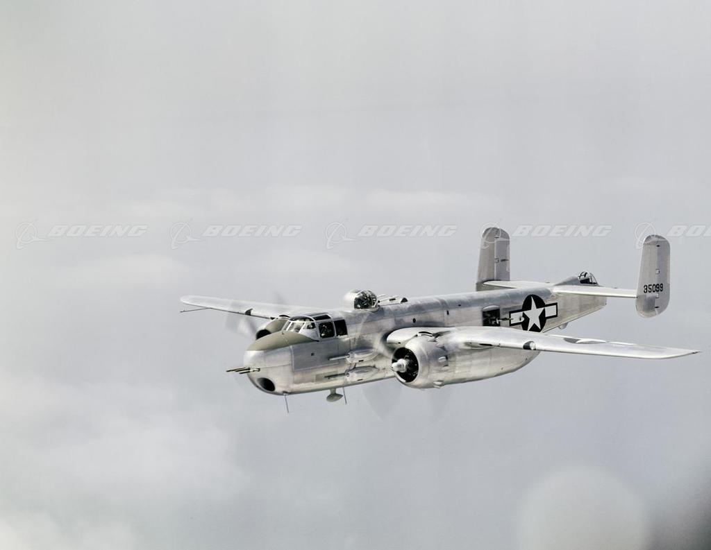 Named after General 'Billy' Mitchell, America's foremost supporter of air power, the B-25 Mitchell first flew on Aug. 19, 1940, and was the first multiengine design to go beyond the prototype stage. North American Aviation built more than 11,000 B-25s for the U.S. Army Air Forces and the U.S. Navy, which called it the PBJ, plus 50 each for China and Great Britain. The B-25 bomber had a wingspan of 67 feet and was 52 feet 11 inches long. One version, the B-25H, was the most heavily armed attack bomber of its time, with a 75-millimeter gun, up to 14 .50 caliber machine guns and 5,000 pounds of bombs carried in an internal bomb bay.