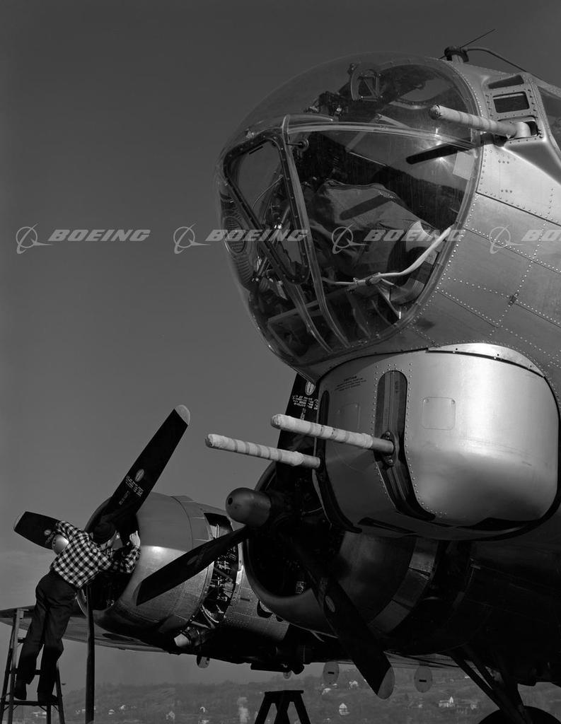 In response for the Army’s request for a large, multiengine bomber, the B-17 (Model 299) prototype, financed entirely by Boeing, went from design to flight test in less than 12 months. The B-17 Flying Fortress was a low-wing monoplane that combined aerodynamic features of the XB-15 giant bomber, and the Model 247 transport. The B-17 was the first Boeing military aircraft with a flight deck instead of an open cockpit and was armed with bombs and five .30-caliber machine guns mounted in clear blisters. Each version of the B-17 was more heavily armed. Described by General H. H. Hap Arnold, as the backbone of our worldwide aerial offensive, the B-17 Flying Fortress served in every World War II combat zone. Boeing, Douglas, and Lockheed Vega produced 12,731 B-17s, and the four-engine bombers became legendary for their ability to stay in the air after taking brutal poundings.