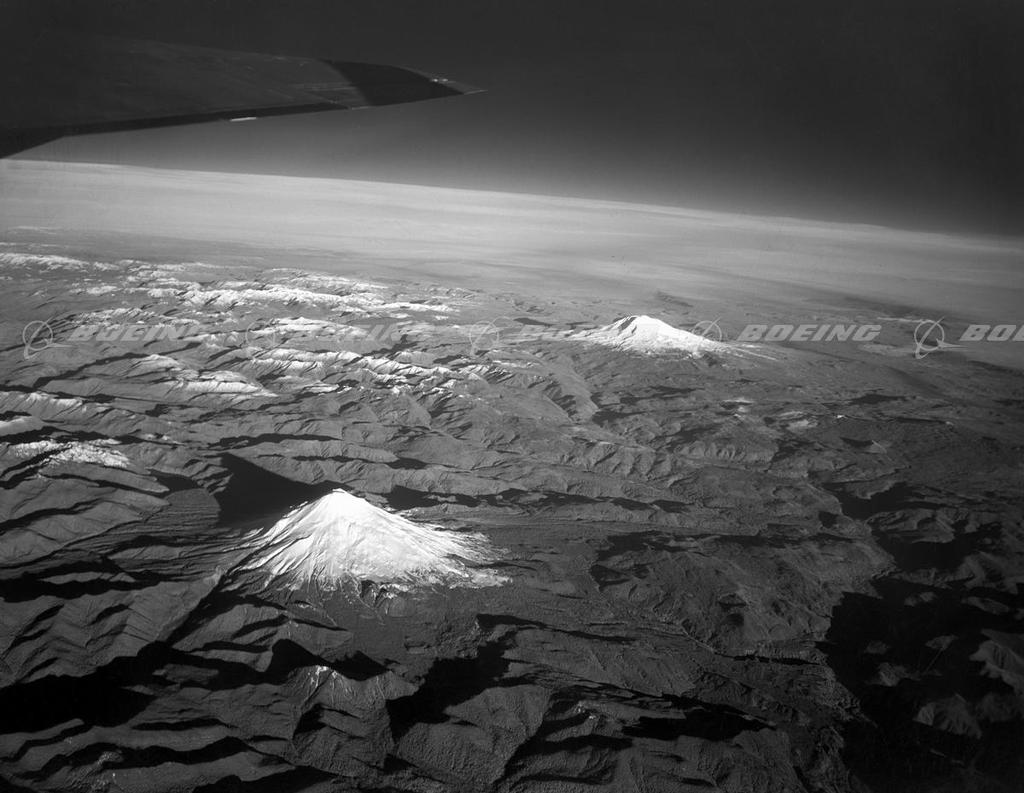 Taken from a Boeing B-29 Superfortress flying at 40,000 feet, two of Washington State's major mountain peaks look like rather small ice cream dishes. In foreground is Mt. St. Helens, (9,671 foot elevation); while almost 40 miles away is 12,307 foot Mt. Adams. Both peaks are glacier-covered the year round. Thousands of square miles of green forest lands extend on all sides of these two peaks. The Columbia River Basin country is to the right, while Canada is beyond the haze in top of picture. Photograph was made by a member of Boeing's engineering flight test crew, while making high altitude test flight near Seattle.
