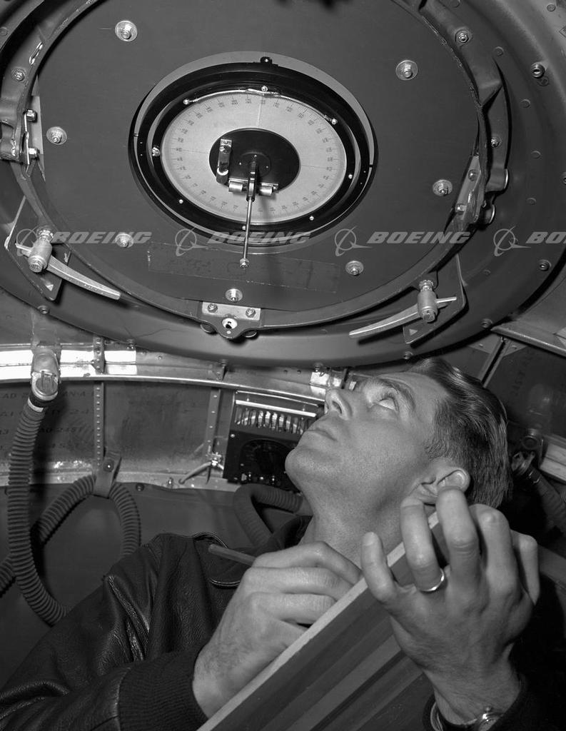 This is a view of the Boeing-designed and Boeing-built shadow compass installed in a Flying Fortress. An instrument technician takes a reading from the compass, which is installed in the astrodome of the Fortress and is used to check variations on the airplane compass.
