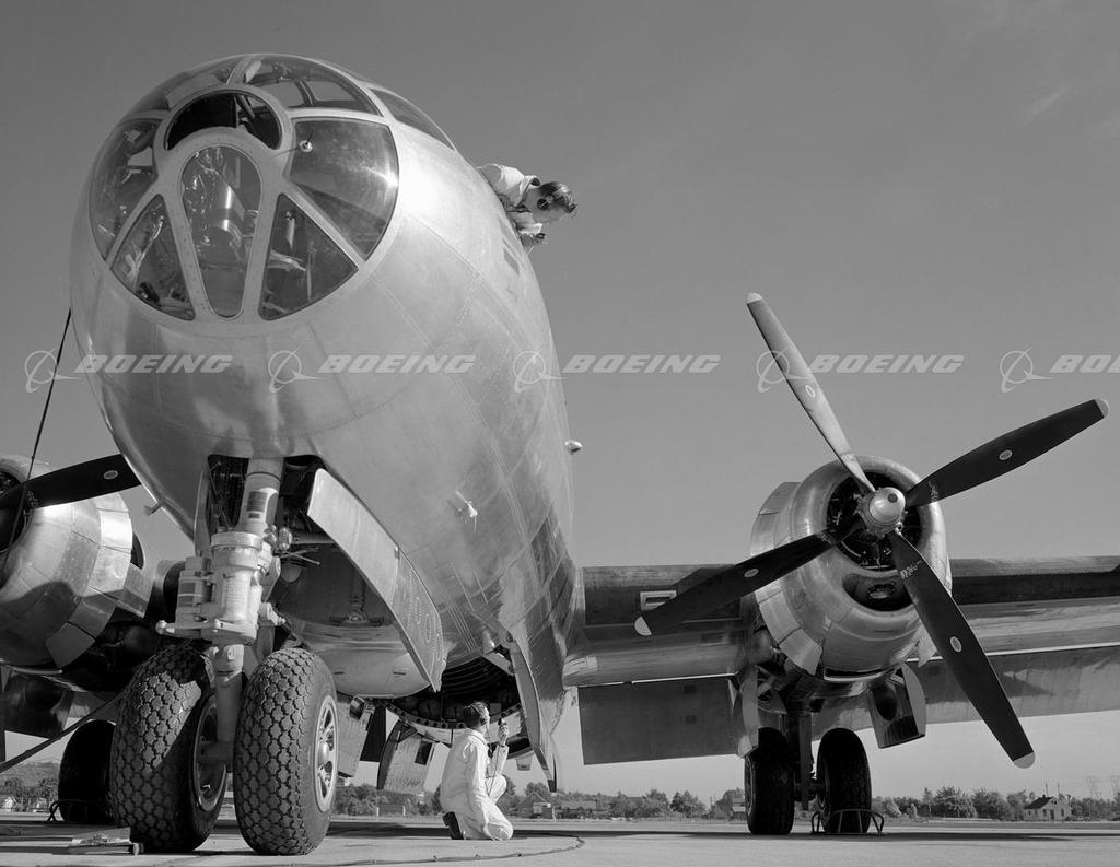 The Boeing B-29 Superfortress, the most technologically advanced airplane produced during World War II, first flew Sept. 21, 1942. The B-29 had many new features, including guns that could be fired by remote control. The crew areas were pressurized and connected by a long tube over the bomb bays. The tail gunner had a separate pressurized area that could only be left during unpressurized flight. At 105,000 pounds, the B-29 was also the heaviest production plane because of increases in range, bomb load and defensive requirements. The B-29 used the high-speed Boeing 117 airfoil, and its larger Fowler flaps added to the wing area as they increased lift. Modifications led to the B-29D, upgraded to the B-50, and the RB-29 photo reconnaissance aircraft. The Soviet-built copy of the B-29 was called the Tupolev Tu-4. A total of 3,970 B-29s were built.