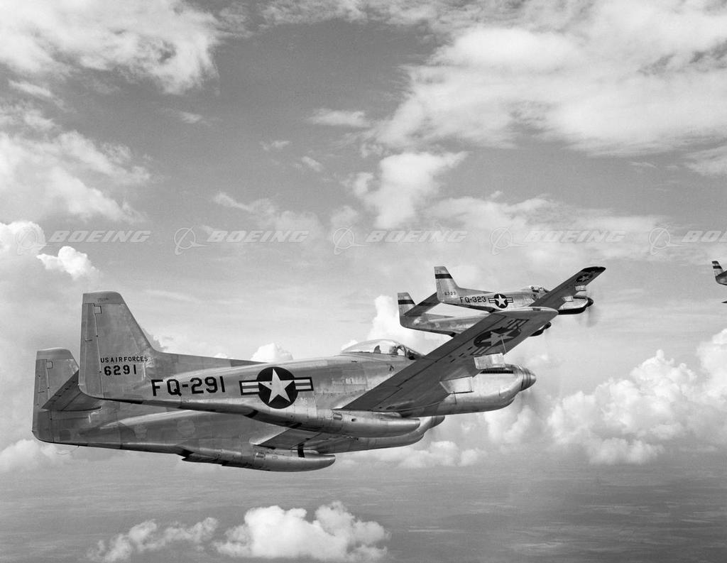 The North American P-82 Twin Mustang was the climactic development of a long series of the famous World War II P-51 Mustang series. North American produced 250 of the double-fuselaged airplanes for the Air Force, embracing three versions of the Twin Mustang then in service, the P-82E, P-82F, and P-82G. The versatility of the P-82 made it potentially adaptable to a wide variety of roles in modern aerial warfare. It could have been used as a fighter, a long-range escort, long-range reconnaissance, night fighter, attack bomber, rocket fighter or an interceptor. With a speed of more than 475 miles an hour, the Twin Mustang had a combat range of over 1,600 miles with full armament. Range could be extended by use of external drop tanks on the wings. A radical departure from the conventional single-fuselage airplane, the Twin Mustang was formed by two fuselages joined by the wing and the horizontal stabilizer. With a pilot in each fuselage, it reduced the problem of pilot fatigue on ultra-long-range missions. The P-82F and G models carried a radar operator in the right cockpit instead of a co-pilot.