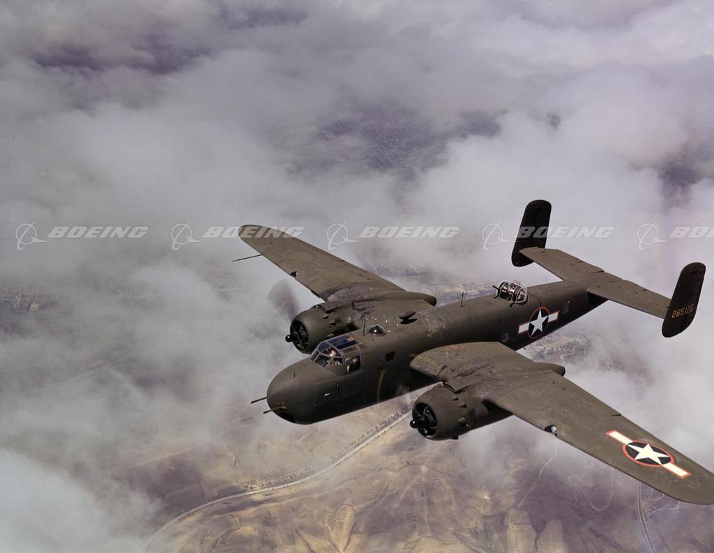 Named after General 'Billy' Mitchell, America's foremost supporter of air power, the B-25 Mitchell first flew on Aug. 19, 1940, and was the first multiengine design to go beyond the prototype stage. North American Aviation built more than 11,000 B-25s for the U.S. Army Air Forces and the U.S. Navy, which called it the PBJ, plus 50 each for China and Great Britain. The B-25 bomber had a wingspan of 67 feet and was 52 feet 11 inches long. One version, the B-25H, was the most heavily armed attack bomber of its time, with a 75-millimeter gun, up to 14 .50 caliber machine guns and 5,000 pounds of bombs carried in an internal bomb bay.