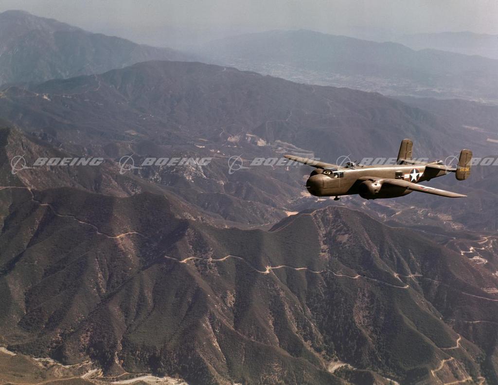 Named after General 'Billy' Mitchell, America's foremost supporter of air power, the B-25 Mitchell first flew on Aug. 19, 1940, and was the first multiengine design to go beyond the prototype stage. North American Aviation built more than 11,000 B-25s for the U.S. Army Air Forces and the U.S. Navy, which called it the PBJ, plus 50 each for China and Great Britain. The B-25 bomber had a wingspan of 67 feet and was 52 feet 11 inches long. One version, the B-25H, was the most heavily armed attack bomber of its time, with a 75-millimeter gun, up to 14 .50 caliber machine guns and 5,000 pounds of bombs carried in an internal bomb bay.