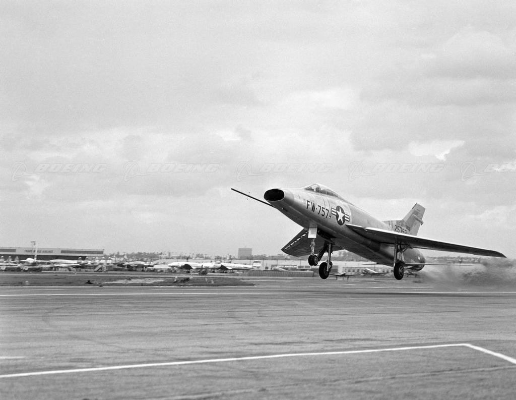 The F-100 Super Sabre was a sleek, swept-back-wing fighter that gave the United States a supersonic Air Force. Since May 1953, when the first prototype model, the YF-100, bettered the speed of sound on its first flight, the versatile fighter set numerous records for speed, endurance, range and maintenance. Late production models of the F-100D and F-100F had the capability of being launched from remote areas in the manner of manned missiles. Of the 2,290 Super Sabres produced, 1,274 F-100Ds included the first autopilot designed for a supersonic jet. Powered by a 16,950-pound-thrust afterburning jet engine, the F-100 was armed with four 20-millimeter cannons, two GAM 83A Bulldog missiles, four Sidewinder missiles, rockets, special stores, and/or 7,040 pounds of bombs.To demonstrate the ability of its pilot and aircraft, the Air Force chose F-100 Super Sabres to perform throughout the world in aerial precision demonstration flights. The famed Thunderbirds, a four-man aircraft team, were viewed by over 19 million people as the storied pilots performed intricate precision maneuvers at low altitude.